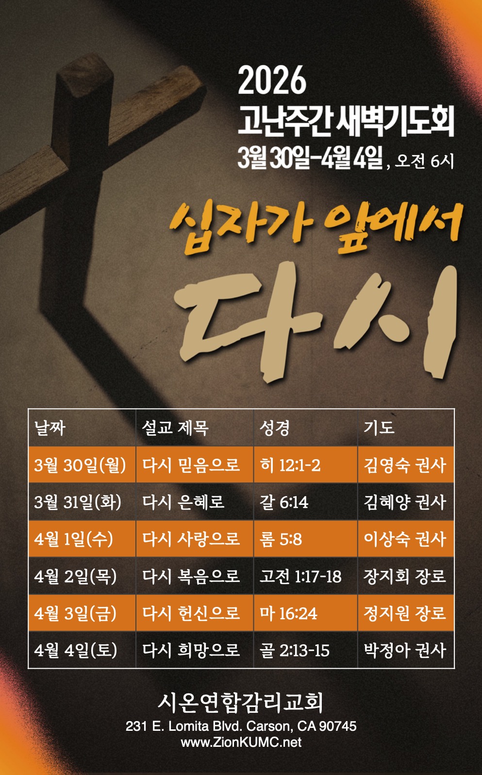 ‘고난주간 새벽기도회’는 십자가 앞에서 나를 다시 돌아보고, 다시 길을 찾고, 다시 일어서게 하는 은혜의 기회가 될 것입니다. 피곤하고 분주한 일상이지만, 이 한 주간만큼은 주님께 시간을 구별하여 드립시다. 새벽 제단에서 함께 십자가를 바라보며 무너진 우리의 신앙과 삶이 ‘다시’ 회복되는 감격과 은혜가 넘치게 되기를 간절히 소망하며 여러분을 십자가 앞으로 초대합니다.